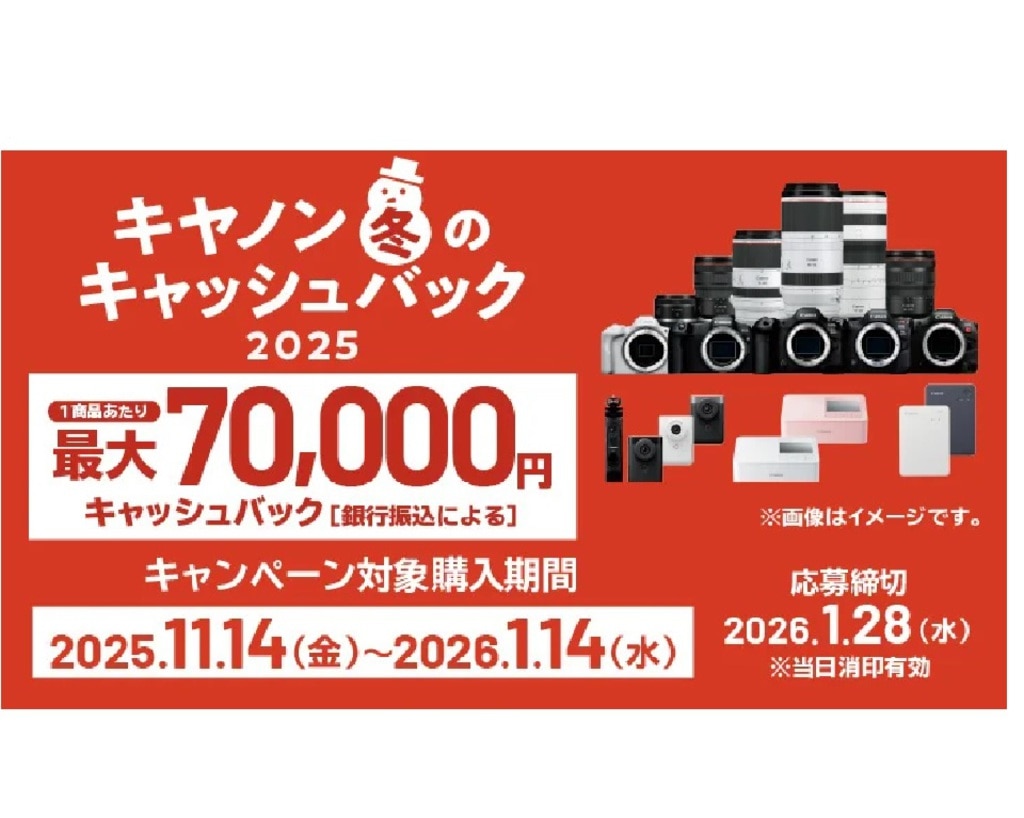 キヤノン 冬のキャッシュバック2025(以下「本キャンペーン」)では、キャンペーン対象購入期間内に新品の対象商品を購入し、当社指定の手続きに従い応募期間内に不備なくご応募されたお客さまに、キャッシュバック致します。また、EOS学園に関する簡単なアンケートにお答えいただいたお客さま※に、【写真教室 EOS学園 受講料割引クーポン(2,500円分)】をプレゼント致します。※キャッシュバックキャンペーン対象商品のカメラ・レンズをご購入いただいた方が対象です(SELPHY CP1500・QX20は除く)※